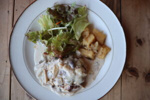 小江戸黒豚の食べ応えのある粗挽き肉と、ジューシーな細挽き肉を組み合わせました。秋・冬季節限定のきのこクリームソースは、こってりと濃厚な味に仕上がりました。