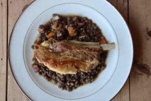 小江戸黒豚のお肉旨味たっぷりのやわらか骨付きスペアリブと、しっかりとした食感のレンズ豆をじっくりと煮込みました。ジェロームさんおすすめのひと皿です!